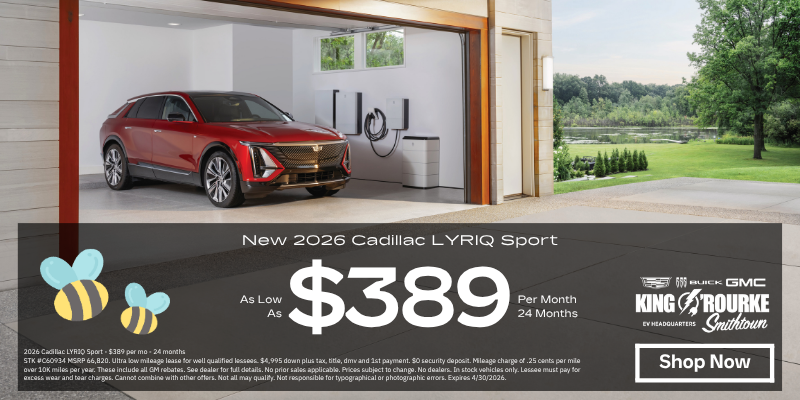 2026 Cadillac LYRIQ Sport - $389 per mo - 24 months STK #C60934 MSRP 66,820. Ultra low mileage lease for well qualified lessees. $4,995 down plus tax, title, dmv and 1st payment. $0 security deposit. Mileage charge of .25 cents per mile over 10K miles per year. These include all GM rebates. See dealer for full details. No prior sales applicable. Prices subject to change. No dealers. In stock vehicles only. Lessee must pay for excess wear and tear charges. Cannot combine with other offers. Not all may qualify. Not responsible for typographical or photographic errors. Expires 4/30/2026.