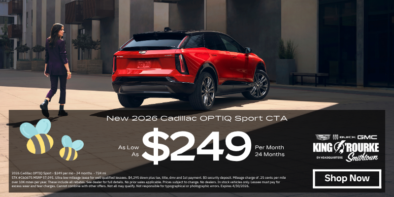 2026 Cadillac OPTIQ Sport - $249 per mo - 24 months - 724 mi STK #C60675 MSRP 57,095. Ultra low mileage lease for well qualified lessees. $4,295 down plus tax, title, dmv and 1st payment. $0 security deposit. Mileage charge of .25 cents per mile over 10K miles per year. These include all rebates. See dealer for full details. No prior sales applicable. Prices subject to change. No dealers. In stock vehicles only. Lessee must pay for excess wear and tear charges. Cannot combine with other offers. Not all may qualify. Not responsible for typographical or photographic errors. Expires 4/30/2026.